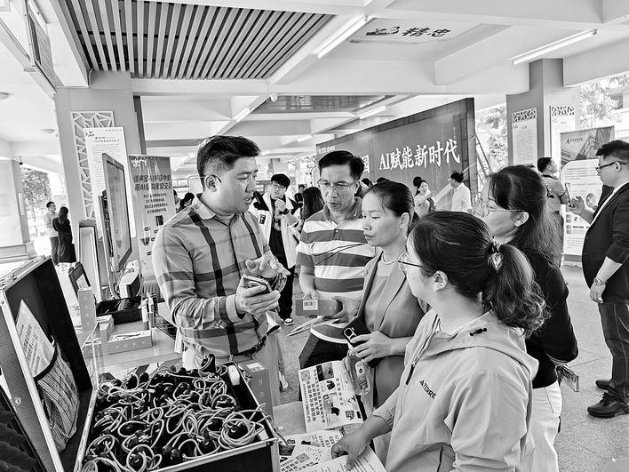 在“人工智能+教育”发展应用产品展示展区,众多科技企业带来最新研发的人工智能发展应用产品。 (甘贞贞 摄)