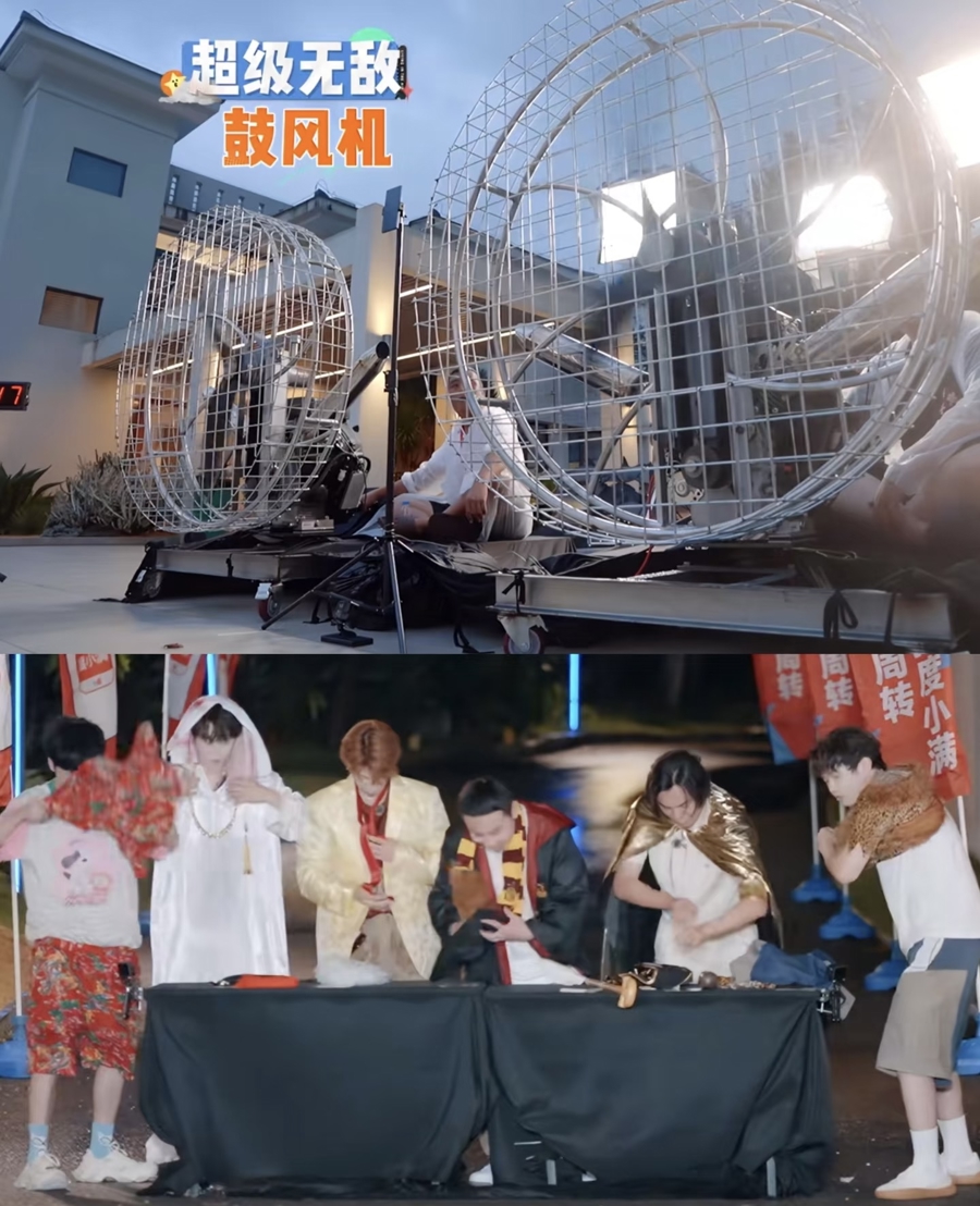 面对户外综艺普遍存在的“游戏荒”困境,《快乐趣吹风》采用“复合型设计”与“因地制宜”策略突围。例如,结合节目名“快乐趣吹风”设计的“鼓风机挑战”不仅复刻经典,更融入海南地域特色与艺人个性反应,赋予环节新意。