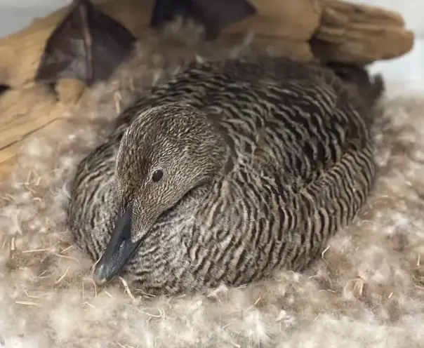 小绒鸭会先叼来树枝、青草、海藻搭好巢底,再从自己身上拔下细软绒毛再铺一层。