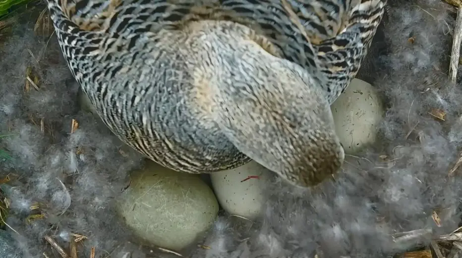 这些蛋得孵将近一个月,雌鸭会寸步不离地守着巢穴,每天只敢趁天敌活动较少时,觅食十几分钟,速去速回。